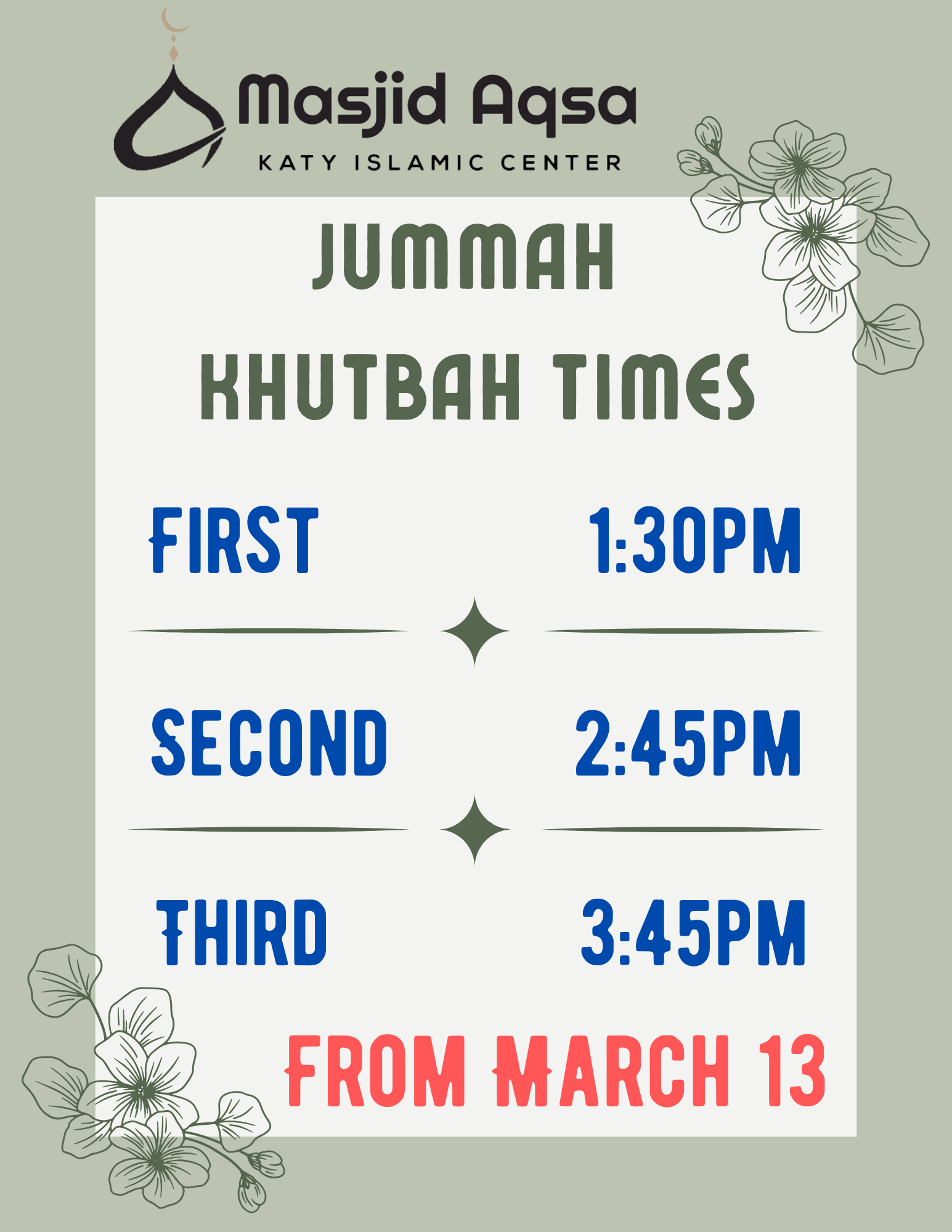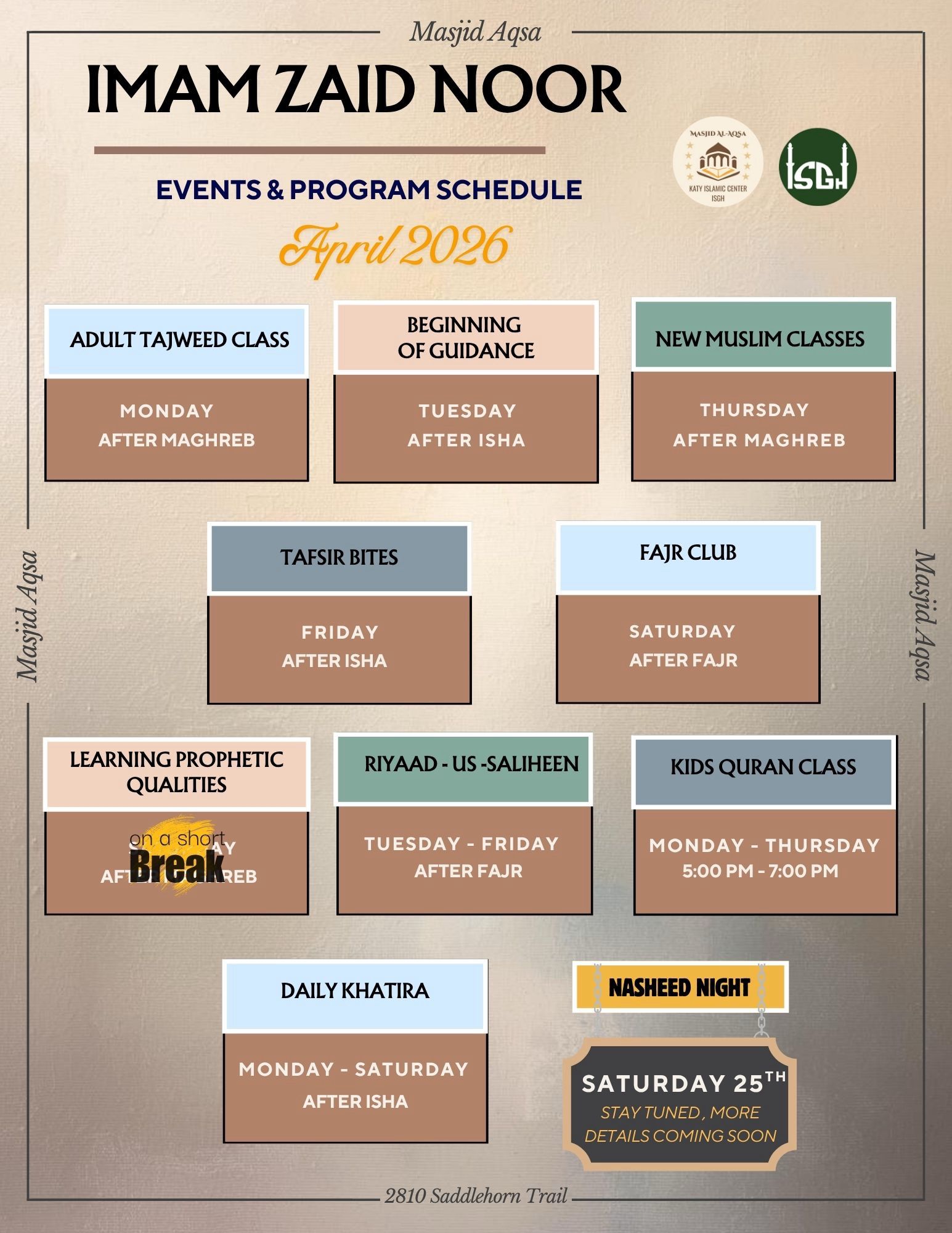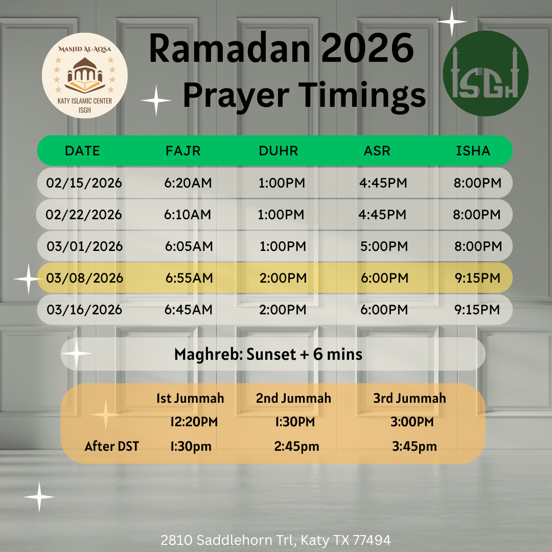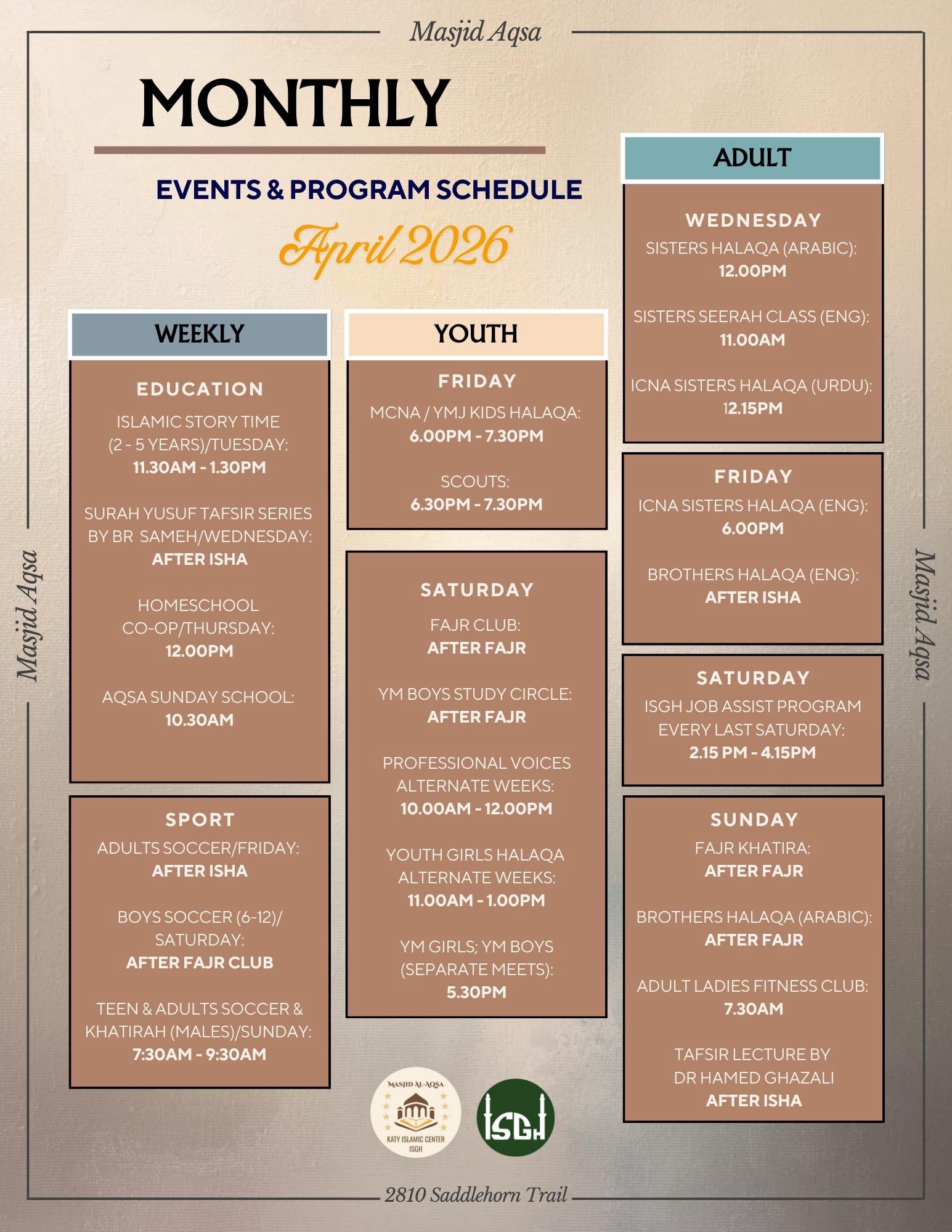 Masjid Aqsa Islamic Center was founded in 2001 and is a 501 (c) non-profit organization located in Katy, TX, and is an institution that is run under the Islamic Society of Greater Houston. It serves its own Katy community, as well as its guests from all over Houston.