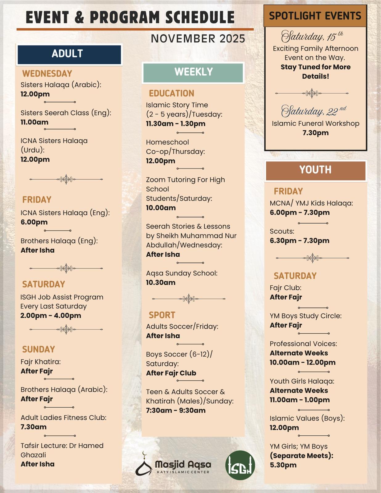Upcoming Events and Weekly Programs at our Masjid